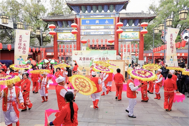 活动尚未正式开始,陕北非遗秧歌队的精彩表演已点燃现场氛围。鲜艳的绸带飞舞,欢快的鼓点铿锵,队员们围绕会场巡游互动,引导观众融入这场民俗盛宴。