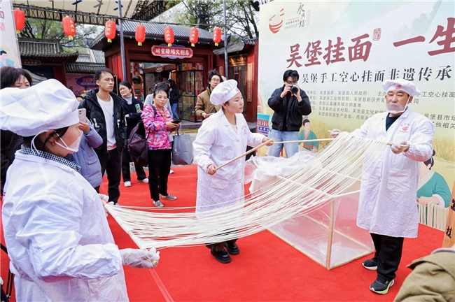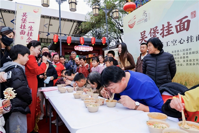 2025年11月14日,“吴堡挂面,一生挂念”万人挂面宴第二场活动走进了陕西最大的非遗美食街区——永兴坊。永兴坊作为唐代长安城108坊之一,自2007年便以中国首个 “非遗美食文化” 主题街区的定位,成为承载陕西千年文化、展示非遗魅力的重要地标。 这场集非遗展演、美食品鉴、互动挑战于一体的文化盛会,让陕西省非物质文化遗产吴堡手工空心挂面走出黄土高原,走进西安市民的生活,用匠心与美味书写非遗传承新篇。