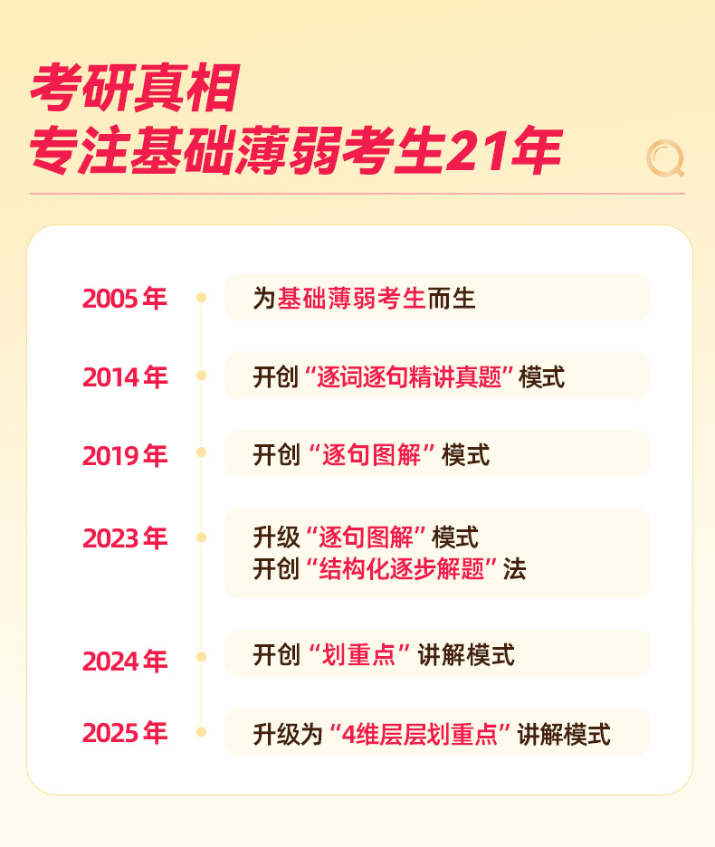 2005年,"考研真相”敏锐地捕捉到基础薄弱考生“做不对真题、看不懂解析”的核心痛点,率先聚焦这一群体,推出“基础薄弱考生专用的考研英语真题书”,并创新打造了“逐词逐句精讲真题”模式。这一模式彻底打破了传统真题书“重答案、轻解析”的局限,通过逐词逐句的精细化讲解,扫清了基础薄弱考生的复习障碍,迅速成为考研英语真题书的标配。