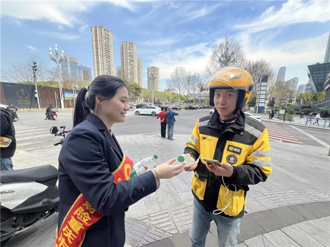 结合当日高温天气,我司工作人员为一线从业者送上矿泉水、定制宣传扇等慰问品,送去清凉关怀。现场快递、外卖从业人员纷纷点赞,直言服务贴心、实用。同时,工作人员现场指导大家使用“空中服务”小程序、中国人寿财险APP,便捷办理投保、报案、理赔等业务,以公益服务与实用宣教,切实提升新就业群体保障意识与保险服务获得感。