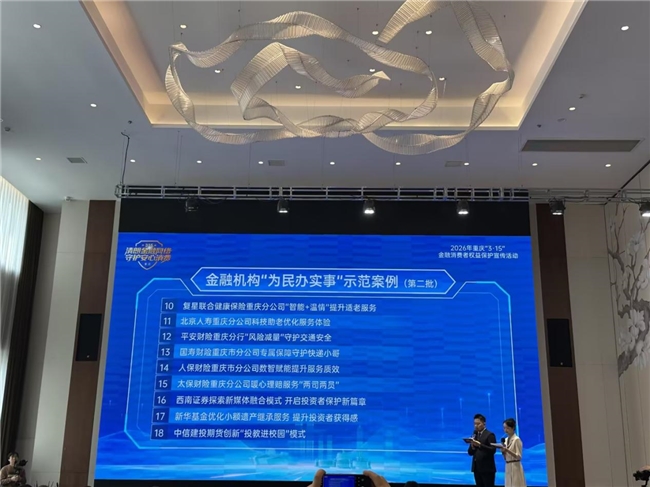 同时,我司“专属保障守护快递小哥”服务案例成功入选市局金融机构“为民办实事”示范案例,在启动仪式集中展示,成为全市金融行业服务民生、践行责任的典型示范。 活动现场,两江监管分局局长、成渝消保中心理事长莅临现场,与中国人寿集团在渝成员单位——国寿财险重庆市分公司、中国人寿重庆市分公司、广发银行及人寿养老重庆市中心等机构代表合影留念,共同见证重庆金融消保工作的重要时刻,展现了中国人寿集团在渝成员单位凝心聚力、共护金融消费者权益的责任担当。