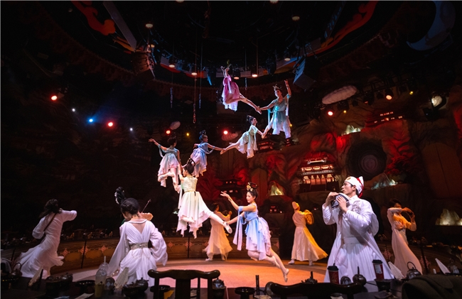 「现场对叙敦煌项目空间结构与内容表达进行讲解交流」 在此次调研过程中,代表团对「叙·敦煌」项目的整体空间结构、内容编排逻辑及沉浸式体验路径进行了系统性考察,并围绕敦煌文化元素在当代语境中的转译方式展开重点讨论。交流内容涵盖文化符号的视觉呈现、叙事结构的当代表达、观演关系的重构以及文化体验与消费场景的融合机制等多个维度。 「叙·敦煌」以上海城市空间为载体,以敦煌壁画中的飞天形象、丝路故事及古代乐舞为核心灵感,通过“空间+演绎+餐饮”的复合体验形态,将传统文化内容转化为可参与、可沉浸的文化场景。项目在呈现过程中,注重文化元素的系统化重构与体验逻辑的完整性,尝试在当代语境下建立起连接历史文化与城市生活的新表达路径,建立成一个文旅景点。