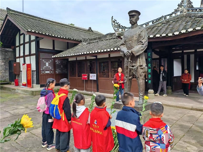 上午9时,孩子们统一乘车抵达朱德旧居陈列馆。在社区志愿者和讲解员的带领下,大家有序参观陈列馆,认真聆听朱德同志的革命故事。一件件珍贵文物、一幅幅历史照片、一段段感人故事,让孩子们深切感受到革命先辈的崇高理想与坚定信念。 参观结束后,缅怀仪式在陈列馆前庄重举行。全体人员肃立默哀一分钟,向革命先辈表达深切缅怀与崇高敬意。随后,少先队员代表向朱德同志塑像敬献鲜花。在鲜艳的队旗下,全体少先队员高举右拳,重温入队誓词:“我是中国少年先锋队队员……准备着,为共产主义事业贡献力量!”铿锵誓言回荡在陈列馆上空,展现了新时代青少年继承先烈遗志、奋发向上的精神风貌。 活动最后,孩子们化身“文明祭祀宣传员”,在连云社区周边开展志愿服务向居民发放文明祭祀倡议书,倡导鲜花祭扫、网络祭扫等绿色环保方式,用实际行动传递文明新风。 此次活动将红色教育与志愿服务相结合,让孩子们在沉浸式体验中接受精神洗礼。家长们纷纷表示,这样的活动很有意义,不仅让孩子们了解了革命历史,更增强了他们的社会责任感和爱国情怀。下一步,连云社区将继续用好红色资源,丰富活动形式,引导青少年扣好人生第一粒扣子,让红色基因代代相传。